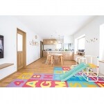 陽だまりの中で、木のぬくもりを感じながら過ごしていただけます。 キッズパズルマットを敷いた場所は、息子さんがのびのび遊んだり、お昼寝したりする場所です。クッション性があるので、滑り台で遊んでも、万が一転んでも安心。遊びながら、自然に数字やアルファベットに触れられます。