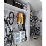 玄関横の引き戸から、ロードバイクを置いている土間へと抜けられます。土間には勝手口があり、必要に応じて出入りを使い分けられます。 壁掛けフックに、お出掛け用の帽子やリュックを掛けられるので、外出時も円滑です。