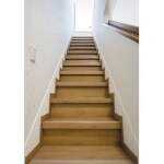 傷んでいた壁紙を貼り替えて、既存階段の上から貼り重ねるリフォーム用階段を施工しました。 そのまま既存階段を生かせるため、リフォームの場合でも工期が短期間で済みます。 オーク系の床材に合わせた色柄を組み合わせて、室内を移動しても違和感なく整えました。