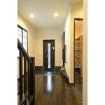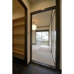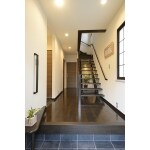 階段をストリップ階段に架け替え、玄関に隣接する和室押入れ部を玄関からのシューズクロークにプラン変更する事により、玄関の広がりを演出。玄関ドアも閉めたままでも通風できるタイプに変え、通風性も高めました。 玄関に入れば、玄関正面のストリップ階段下の式台に飾られた四季折々の花が来客者を優しく招き入れます。