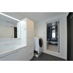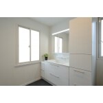 洗面室の位置を変え、洗面化粧台の扉色も変える事により、明るい洗面室へ!!