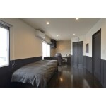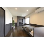 正面の壁の素材を変えワンポイントに。照明をダウンライトに変え部屋内をすっきりとさせました。