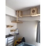 子猫の活発な性質を安全面から考慮し、走り抜けられないよう、部材の長さを考慮しました。 その一方で、猫が退屈しないためにハシゴやジャンプスペースを設置し、猫が好きな隠れスペースも設け居心地良い様プランニングしました。