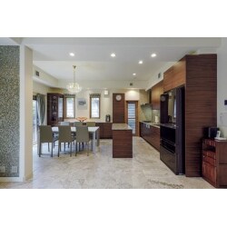 ・壁面を美しく彩る大理石やガラスのモザイクスタイルを提案し、リビングの斜め壁、キッチンや洗面化粧台の壁面に採用した。 ・細部にわたりオーダーメイドできるメーカーのショールームをご一緒に巡った。 ・キッチンの壁を取り払い、リビングともオープンにつながったダイニング・キッチン。木や石、ガラスの素材感を主役にしたインテリアがシック。全館空調のダクトスペースは空調効率も考慮して四方にまわし、折り上げ天井のような趣に。壁の角を丸くする処理も新たに施し、やわらかな印象に仕上げた。
