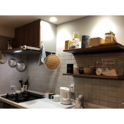 オーク色のキッチンの扉や棚板とグレー色の組み合わせがクールな印象になりました。