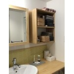 大きな鏡を、収納スペースのある鏡とオープンな棚に変更。 正面の壁のアクセントになるタイルも雰囲気が出てより素敵空間に。