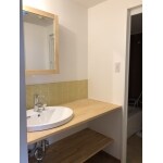 ホワイトの洗面カウンターに、壁には大きい一面鏡がありました。 リノベーション前もとても綺麗にお使いになられていました。