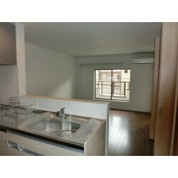 リビング全体を見渡すことができるステンレス製L型キッチン