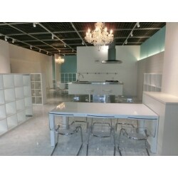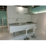 店舗内の家具やシェルフはH様との打ち合わせて決めさせていただきましたこだわりの商品です。 エントランスのソファーとシャンデリアはアンティーク調で揃えました。 キッチンカウンターの椅子、カフェスペースの丸テーブルと椅子、ワークスペースの透明の椅子、 エントランスのフロアーランプや下駄箱、シェルフはIKEAの商品です
