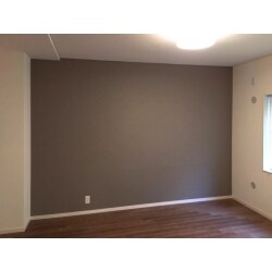 全体的に白を基調としたクロスにした事で明るさを出し、一面だけフロアと同じ色のアクセントクロスを張り大人っぽい清潔感のある空間を演出しました。また、床材はお掃除のしやすさの事を考え表面がつるっとしたフロアタイルをご提案させて頂きました。