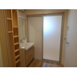 無垢の雰囲気にしたい。洗面室が暗くて狭く使いづらい。 広げて、温かみのある空間にしたい。
