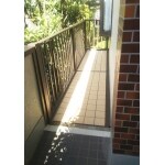 外階段と2階の玄関とベランダの壁を撤去しベランダを延長しました。 スタンダードでシンプルなLIXIL ビューステージH 縦太格子を採用しました。床面は、しっかりとした踏み心地、安心感と心地よさのあるジョーブ床のタイルタイプをご選定いただきました。