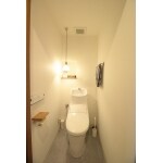 シンプルな設備とブルーの壁紙で清潔のあるトイレ空間に。