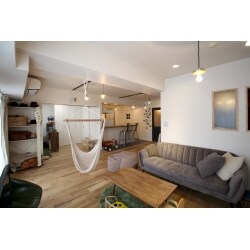 フローリングには無垢材を採用し、とても落ち着きのあるナチュラルな雰囲気に仕上げました。 ハンモックはお子様はもちろんのこと、大人が乗っても大丈夫なので、読書やお昼寝など、ゆったりとした時間を過ごすことができます。
