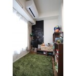 洋室の一角をお子様専用スペースに。 自由にお絵かきができる黒板クロスで、楽しいひとときを過ごすことができます。 仕切りは設置せずに家具で個室感を演出。お子様にとっては秘密基地のような感覚で、ご両親にとっては視界にお子様が入る状態で遊ばせることができる、安全で楽しい遊び場スペースに仕上げました。
