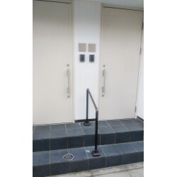玄関が2つの二世帯住宅の玄関の階段に手摺りを新設しました。 子供や女性、高齢者や手の小さい方もしっかりと握り込める小さな径のエトランポSを採用しました。ベーシックなアルミ形材タイプでスッキリと仕上がりました。 転倒・転落の防止はもちろん移動もラクになります。快適で安全になったと大変お喜びいただけました。