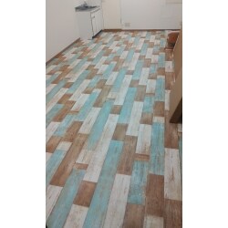 クッションフロアを張替えました。土足使用OKな店舗用クッションフロアはサンゲツ CM-4213 を採用しました。 ペイントウッド柄がオシャレな雰囲気に仕上がりました。 店舗用クッションフロアは厚みが2.3~2.5mmになり、住宅用より耐久性に優れております。