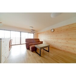 「木をリビングに貼りたいです。ログハウスのように。」 ご主人様の一言で、ぱぁっとプランが固まったことを覚えています。 壁一面に貼る木を、イメージ写真から色々検討しながら、優しく色づいてゆくパインをご選定いただきました。 キッチンのカウンター下にもパイン材をはらせていただき、キッチン奥に見えるレンガ調のアクセントクロスとの相性がバッチリ決まりました。 リビングからみたキッチンの雰囲気はNYテイストで、おしゃれなコーヒータイムを楽しめそうですね。 N様のお人柄をお伺いできるLDKの雰囲気になりました。