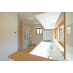 光が差し込む明るいキッチン。キッチンは安心安全なIHを採用しお掃除等のお手入れも簡単。便利な食洗機も設置しました。たっぷり収納できるキャビネット、食品庫も設け使いやすいキッチンになっています。