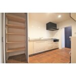 ウォールキャビネットをなくし、キッチン横に天井までの収納棚をつくりました。アコーディオンカーテンは引き戸に変えました。キッチン設備がそのままなのに印象がガラッと変わりました。