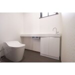 大家族なので1階と2階にトイレを設けました。 1階は広めのトイレ空間。タンクレスタイプのトイレに手洗い器も設けました。