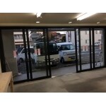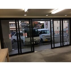 店舗入り口ドア、新聞販売店を移転開業の為改装。大きな機械を店舗内に搬入しなければならない事と、大きく開口できる出入口が無いと作業場不都合なため、全開口出来る出入口工事を希望。