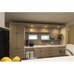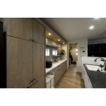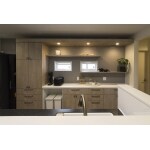 照明や棚の幅・長さ、細部に至るまでお客様の要望があり、その都度打ち合わせを重ね、造作の梁・棚はダイノックシートで既成の背面のキッチンの扉の色と同じ色・柄のものを選び違和感なく仕上げました。