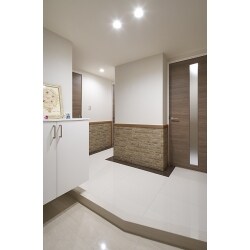 間取り変更を行い、広々とした玄関へ。玄関正面の壁をキッチンへ続く扉とし、回遊性を高めています。