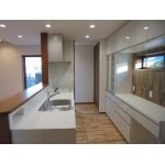 LDKに配置することで、家族と会話しながら料理ができる。 また、大型食器棚を配置し家電も使いやすくなる