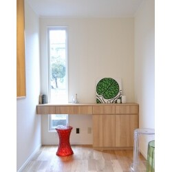 2階の日当たりのよい窓際で、集中して仕事できる空間を提供したいと考えておりました。 仕事用パソコンを設置できること、またワークスペースに必要不可欠なファイルや事務用品を収納できることを条件に、造作家具をフルオーダーメイドで制作しました。