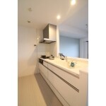 三面鏡になり、裏が全て収納スペースなのでたっぷり入ります。水栓も壁付になりお手入れもしやすいです。