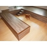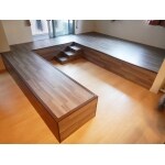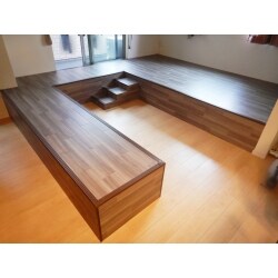 リビング床に小上がりを設けました。 段差に腰かけたり、寝転んだりしてくつろげます。 他にも、洗濯物を畳んだりと家具の代用として使うこともできるので、リラックスするにも家事をするにもちょうどいいスペースになります。 また、床をダイニングテーブルの椅子がわりにすることで、床座テーブルにする方法もでき、友人を招いてホームパーティーも楽しめたりとさまざまな使い方ができます。