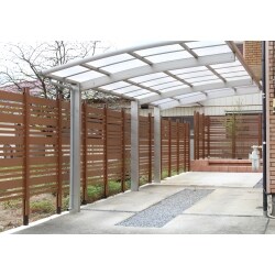 駐車スペースを広げつつ、土面を減らしてローメンテナンスにしました。 カーポートは既設のものがYKKAP製なので、後継機種での連棟施工が可能となりました。 隣地との境界には樹脂製の目隠しフェンスを設置しました。