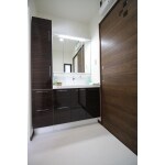 とても明るい雰囲気を保ちつつ、バスルームやほかのお部屋との色合いを合わせてダークブラウンをチョイス。 洗面台間口も広く、収納も充実です。