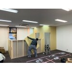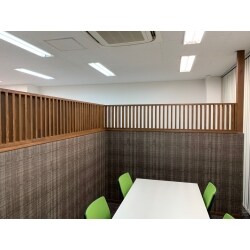 旧事務所は既存タイルカーペット、パーテーションを全て撤去、及び天井の補修、新事務所は応接室の間仕切りと入口の建具造作。 応接室のご要望は ・採光が欲しい ・圧迫感が無い ・インパクトがあり、かつ落ち着くシックな色味 会議室のご要望は ・旧事務所のパーテーション扉を再利用できないか ・一般的な白で統一