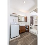 ユニットバスのドアを少し中央にずらしたことで、洗面所に収納棚をつけることができました。使い勝手の良い、ヴィンテージ感漂う、おしゃれな洗面脱衣室に仕上がっています。