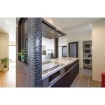 ・リビング、ダイニングに対面したオープンキッチンに変更 ・床にグレー、袖壁にネイビーブルーのモザイクタイルを選び、リビングとはひと味違ったモダンな雰囲気を演出