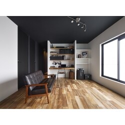 ダークな色の壁や天井、ラフな表情の無垢床、スタイリッシュな照明などデザイン性にもこだわり、全体的に施主様好みのインダストリアルな雰囲気に仕上げました。それぞれの場所が緩やかに繋がることで各々が居場所を持ちつつ、自然にコミュニケーションが生まれる空間づくりを目指しました。