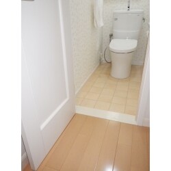 床を下げてバリアフリーにしたので、つまづきの心配がなくなり安心です。 照明はカバーが付いていても明るく感じる昼白色の物に替えました。 白が基調のさわやかなツタ柄のクロスと明るい色味のテラコッタ風クッションフロアでさらに明るい空間になりました。 気になっていた匂いも「きれい除菌水」で解決です。