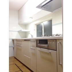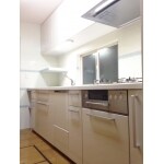 扉は塗装品の柔らかいベージュで、反射で空間を明るくします。フラットでお手入れのしやすいゼロフィルターフード、洗い物がしやすい水ほうき水栓、最新のフロントオープンタイプの食洗機を採用。電子レンジ置場や隙間スペースはタイルで仕上げました。