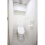 トイレ上のデッドスペースを活用したアッパーキャビネットをご提案しました。間口に合わせ施工でき、18個入りのトイレットペーパーが梱包のまま丸ごと収納できる大容量です。