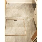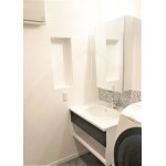 タイル調の人造大理石カウンターは継ぎ目のない一体型。水ハネが気になる部分にはお掃除の楽なタイル調のメラミン板を貼りつけました。 鏡はシンプルな一枚仕様ですが、鏡裏には収納スペースをしっかりと確保。 古い壁面収納を外し、クロスを巻き込んでシンプルなニッチに仕上げました。 洗面台がフロートタイプなので、足元スッキリ&お掃除も楽々です!