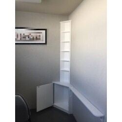 歯科医院の待合室の一部を治療ブースとして増設したい。 スペースが狭くあまり用具を置く場所がないため、造作棚の設置をご提案。