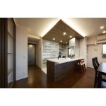 ・床は天然木のウォールナット、キッチン本体と下がり天井にも濃い茶色の木目を取り入れました。 ・下がり天井を設けて間接照明を設置したことで空間に重厚感を演出できました。 ・キッチン背面には全面引き戸のカップボードを造りつけ収納力と耐震性を高めました。