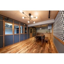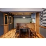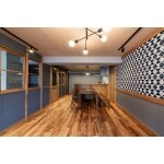 今まで和室2部屋でベランダ側のサッシが閉ざされていたので、その間仕切りを開放。外からの光と風をリビング&ダイニングからキッチンまで取り入れれるよう、工夫した。リビング&ダイニングと隣接する洋室の間仕切壁には8連窓の押し出し窓を設け、10mの室内を風が吹き抜けて気持ちが良くなりました。 また、本物の素材をご希望されていましたので、当社の得意分野である無垢材の造作を提案し、床材と建具、壁面材に採用しました。