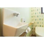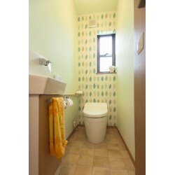 タンクレスのトイレを採用。タンクがなくなった分、位置を後ろへ下げることが出来、前方が広くなりました。 スリムタイプのカウンター付き手洗い器は、手すりと紙巻器も一体になりスッキリしました。 壁は一面を柄のあるクロスにして、アクセントに。 床はテラコッタタイル風で、全体の雰囲気をまとめています。