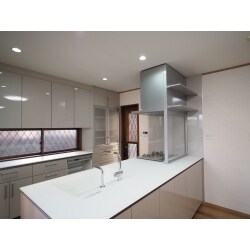 既存はI型対面でしたが、吊り戸を無くしレンジフードのみの高級感のあるTOTO ザ・クラッソのフラット対面型にしました。 ユニットバスは TOTO サザナ Wタイプ。 便器はTOTOのネオレストにし手洗器を別途付けました。 洗面化粧台はTOTO エスクアLSにしました。 リビングの隅にテーブルを置き正面に明り取りの窓を付けました。 他にもリビング床暖房、窓の入替え、フローリングの張替えなど、更に住みやすいお部屋へのご提案をさせていただきました。