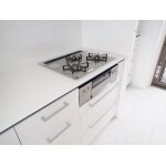 リフォーム後のキッチン お手入れが簡単なスクエアすべり台シンク、ガラストップ両面焼きコンロH、ゼロフィルターフードecoは、整流板が両開き式で、取り付けたまま表も裏もサッとひとふきできるから、お手入れ楽楽。