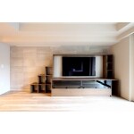 音楽関係のお仕事をされているお客様なので、今お持ちのオーディオグッズや、楽器、書籍、今後も増えることを想定して、重量に耐えられる収納棚を提案致しました。 また、リビングにはキャットウォークになるよう、テレビボードに階段と通路を造作しました。