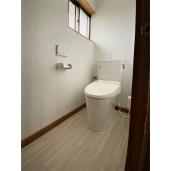 床をクッションフロアに貼り替え暖かいイメージに。トイレもすっきりとしたデザインで明るく清潔感のあるトイレになりました。シャワートイレのリモコンも壁式のものになり操作しやすくなりました。